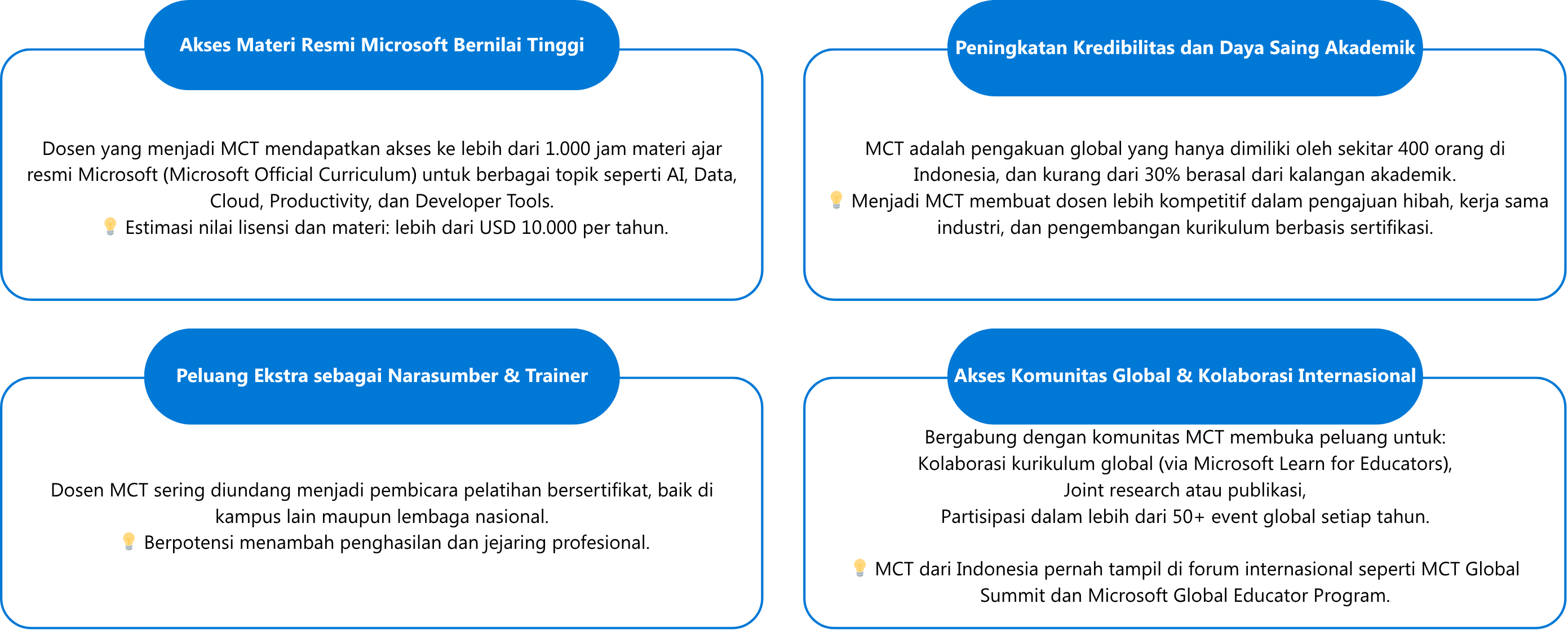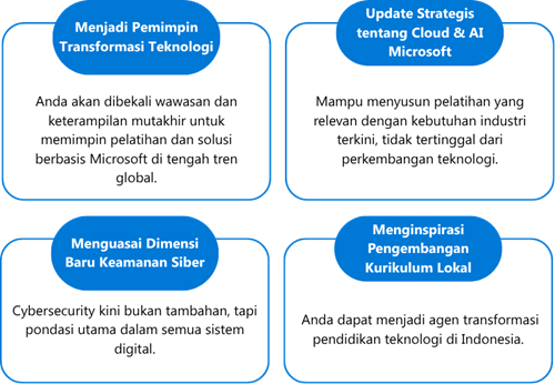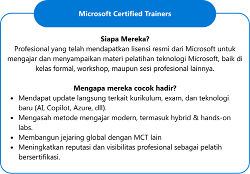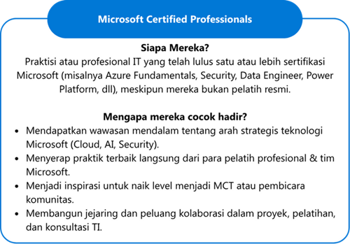 MCT Summit Indonesia 2025 merupakan acara eksklusif yang ditujukan bagi Microsoft Certified Trainers (MCTs) dan Microsoft Certified Professionals (MCP) yang bertujuan untuk mendalami teknologi terkini, seperti Microsoft Copilot dan AI yang disampaikan oleh instruktur berpengalaman, dan mengasah kemampuan mengajar para peserta, sekaligus membangun jejaring dengan sesama MCT dan MCP di Indonesia dan Malaysia. Kegiatan ini diselenggarakan dengan melibatkan para MCT di Indonesia dan MCT Lead Malaysia. Bagi Anda yang tidak dapat hadir pada sesi luring, silakan hadir melalui daring di Microsoft Teams (go.maribelajar.org/room).