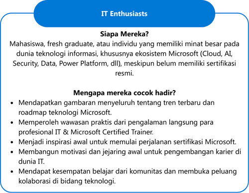 Tidak, kegaitan ini merupakan kegiatan komunitas yang dapat diikuti oleh Microsoft Certified Trainer, dan Microsoft Certified Professional (Individu yang telah memiliki sertifikasi Microsoft)